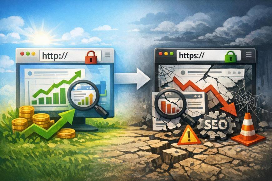 Moving from HTTP to HTTPS isn’t just an update to a single setting. From Google’s perspective, every page on the site becomes a new URL. Each of those new, encrypted addresses needs to be recrawled, re‑indexed, and matched with the right redirects. Until Google completes that process, some loss of traffic or visibility in search results is common.